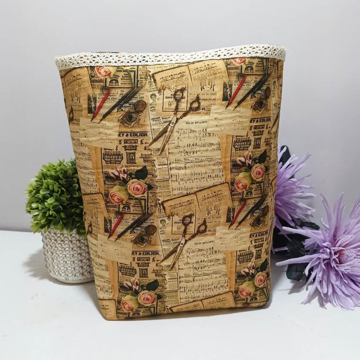 Esta funda literaria tipo saco es una pieza única y no repetible, confeccionada a mano con una tela de inspiración vintage que combina partituras musicales, recortes de prensa antigua y delicadas rosas. El toque final lo da el botón de madera con elástico que asegura el cierre, y un bolsillo exterior funcional ideal para llevar tu bolígrafo o notas.