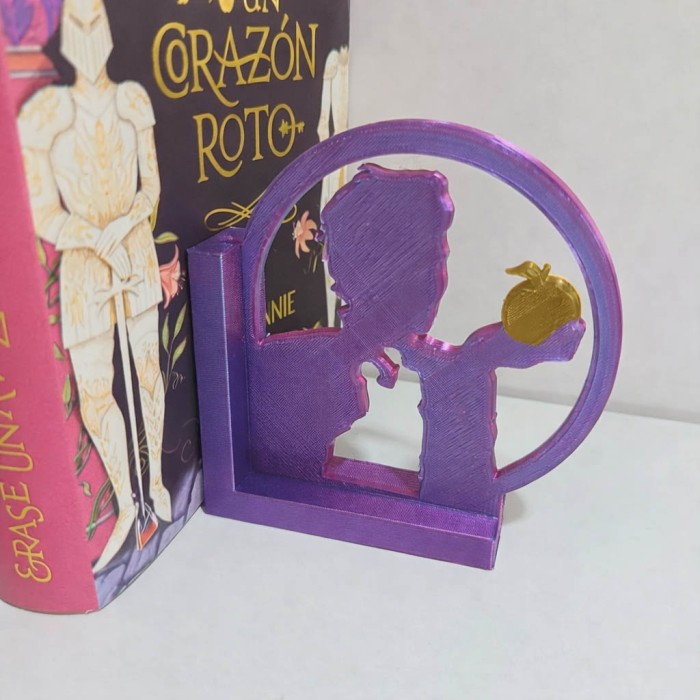 Este sujetalibros está inspirado en el mundo mágico de la saga Érase una vez un corazón roto. Diseñado en un vibrante tono rosa metálico, ha sido creado cuidadosamente mediante impresión 3D, representando una silueta encantadora que conecta con la esencia de los cuentos y las historias clásicas.