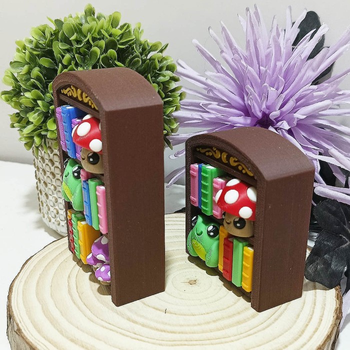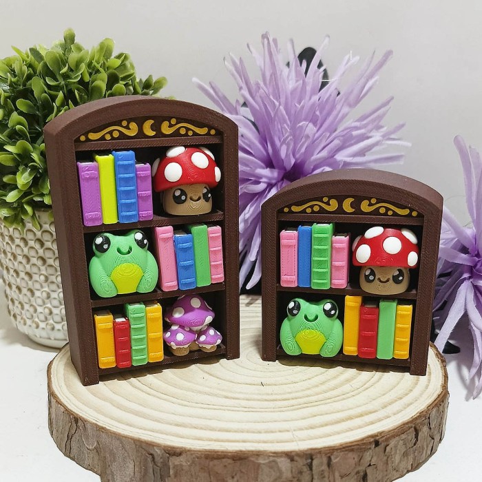 Cada pieza se imprime en nuestro taller familiar, utilizando filamento de alta calidad y mucho mimo. El estante incluye mini libros coloridos y personajes adorables (ranitas, setitas y otras criaturas encantadoras) que convierten cualquier rincón en un espacio más alegre. Al ser un producto impreso capa a capa, es normal que se aprecien líneas sutiles: es parte de su encanto artesanal digital.