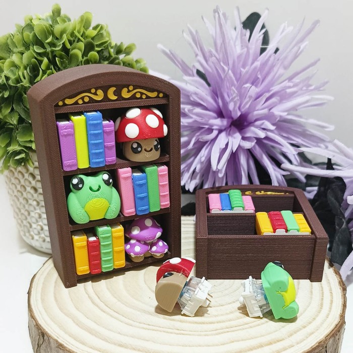 Este estante literario clicker es un pequeño tesoro para quienes disfrutan de los detalles, las miniaturas y ese placer secreto de apretar botones que hacen “clic-clac”. Fabricado con impresión 3D, cada hueco del estante incluye un mecanismo fidget independiente que sube y baja como una tecla, ideal para entretener las manos mientras divagas sobre tu ship favorito o decides qué libro traumatizante leerás después.