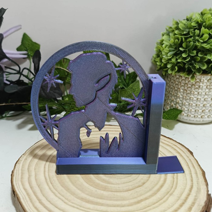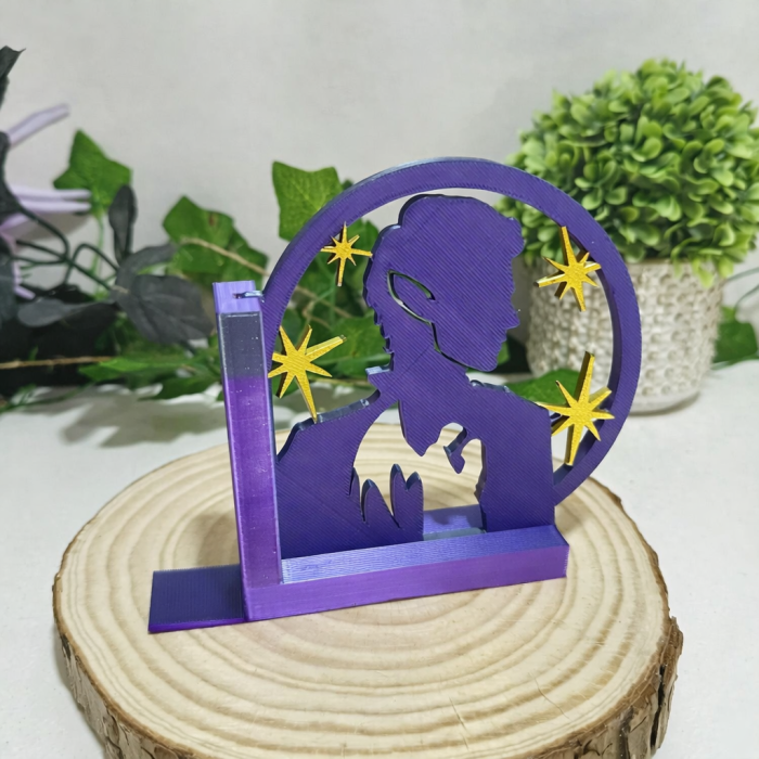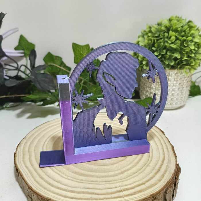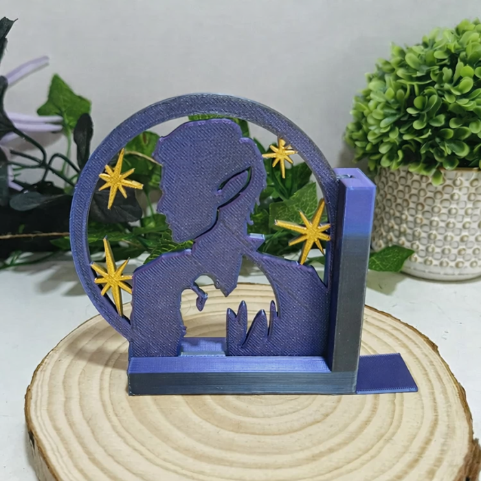 Este sujetalibros está inspirado en la saga Una Corte de Rosas y Espinas (ACOTAR) y destaca por su elegante diseño en tonos morado y negro. Impreso en 3D, representa una imponente silueta de Rhysand, acompañado por una pequeña representación de Rhys y Feyre en un momento emblemático de la historia.